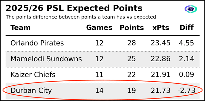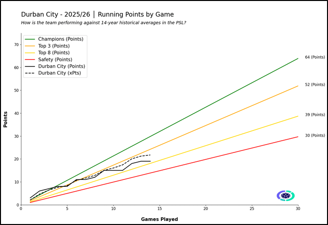 City started life in the top-flight with back-to-back wins against TS Galaxy and Chippa United. This marked only the second time in PSL history a newly promoted team opened their campaign with six points from two games. Notably, the only prior instance was also under Gavin Hunt – 24 years ago, when he led Black Leopards to three straight wins immediately after promotion. It was a dream start, which soon slowed down. A run of three winless matches saw them slide down to 6th by the end of August, but even then their Expected Points and actual points totals were still within the Top 3-4 range.