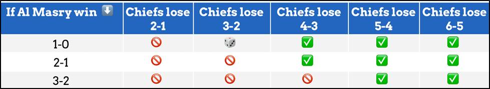 • Moreover, any Al Masry win by a 2-goal margin (or more) will also knock Chiefs out. For example, Al Masry win 2-0, Chiefs are out (irrespective of their losing scoreline).